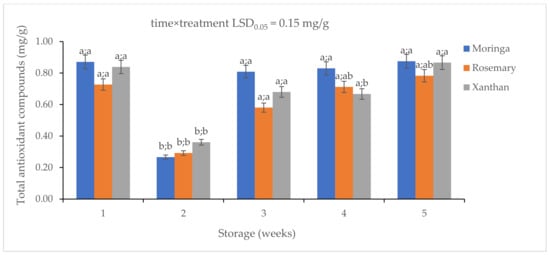 The effect of 2% moringa, 2% rosemary, and 2% xanthan coatings on the concentration of total antioxidant compounds in ‘Ester’ granadilla exocarps during storage (5 weeks; 25 ± 2 °C; 40 ± 5%RH; 8 h light exposure); data are presented as mean ± standard error. The first letters present the significance of the difference caused by time; the second letters present the significance of the difference caused by treatments. The same letters mean a non-significant difference.