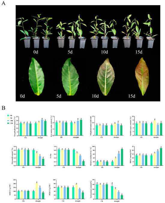 Drought stress treatment and physiological changes of tea plants. (A) Drought stress treatment of tea plants. (B) Physiological changes of tea plants and soil moisture variations. CK is the normal irrigation group; drought is the drought treatment group. 0 d, the 0th day of the experiment; 5 d, the 5th day of the experiment; 10 d, the 10th day of the experiment; 15 d, the 15th day of the experiment. Fv/Fm, maximum photosynthetic efficiency; MDA, malondialdehyde; SOD, superoxide dismutase; POD, peroxidase; different letters indicate significant differences (p < 0.05); data are presented as the mean ± standard deviation (SD).