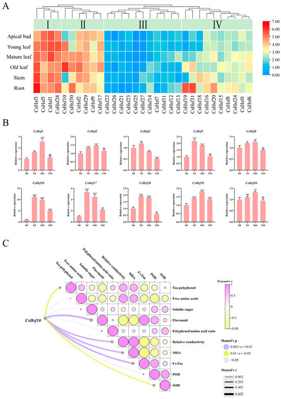 Expression analysis of CsHsfs in different plant tissues and under drought conditions. (A) Heat map of CsHsf expression in different tissues. (B) Relative expression levels of 10 CsHsf genes in mature leaves (the second leaf) at different periods under drought stress. (C) Correlation analysis between CsHsf10 and physiological changes in mature leaves (the second leaf) of tea plants; 5 d, the 5th day of natural drought; 10 d, the 10th day of natural drought; 15 d, the 15th day of natural drought; Fv/Fm, maximum photosynthetic efficiency; MDA, malondialdehyde; SOD, superoxide dismutase; POD, peroxidase; significant differences from CK were determined by Student’s t-test (ns not significant; * p < 0.05; ** p < 0.01; *** p < 0.001); data are presented as the mean ± standard deviation (SD).