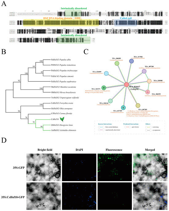 Homologous sequence alignment, phylogeny, and subcellular localization analysis of CsHsf10. (A) Homologous sequence alignment. (B) Phylogenetic analysis of CsHsf10 and homologous sequences from other species. (C) CsHsf10 protein interaction network prediction. (D) Subcellular localization of CsHsf10.