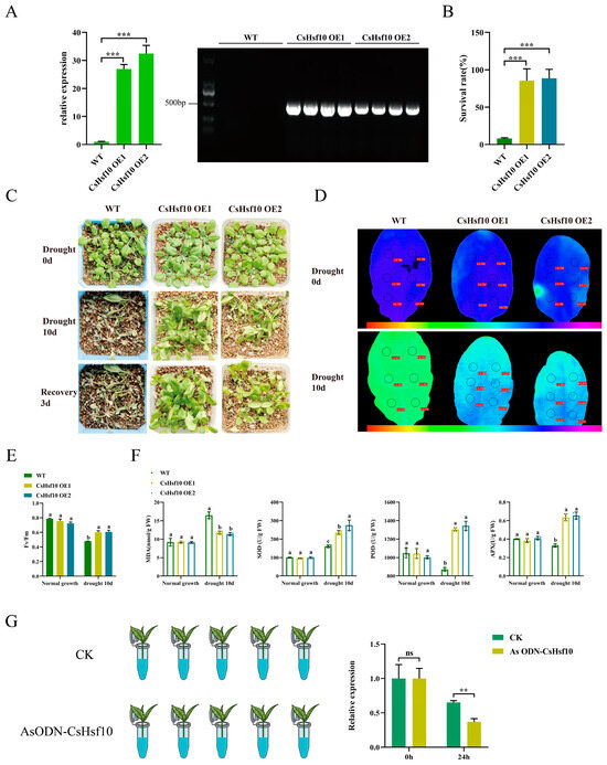 Overexpression of CsHsf10 in Arabidopsis improves drought tolerance. (A) qRT-PCR detection and DNA verification results of CsHsf10 gene in transgenic lines (OE-1, OE-2) and WT plants. (B) The survival rate of Arabidopsis under drought stress. (C) The phenotype of soil planting plants before and after drought stress. (D) Chlorophyll fluorescence imaging before and after drought stress. (E) Changes in Fv/Fm values before and after drought stress. Fv/Fm, maximum photosynthetic efficiency. (F) Changes in MDA, SOD, POD, and APX content before and after drought stress. MDA, malondialdehyde; SOD, superoxide dismutase; POD, peroxidase; APX, ascorbate peroxidase. (G) Treatment of antisense oligonucleotides (AsODN) of CsHsf10 and relative expression level of CsHsf10 at 0 and 24 h after treatment. Different letters indicate significant differences (p < 0.05); significant differences from CK were determined by Student’s t-test (ns not significant; ** p < 0.01; *** p < 0.001); data are presented as the mean ± standard deviation (SD).