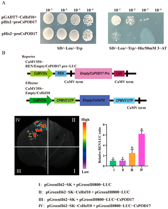 We performed a yeast one-hybrid assay to elucidate the potential regulatory relationship between CsHsf10 and antioxidant enzymes. The complete coding sequence of CsHsf10 was cloned into the pGADT7 vector as the prey, while the CsPOD17 promoter was inserted into the pHis2 vector as the bait. The experimental group consisted of a mixture of the pGADT7-CsHsf10 and pHis2-CsPOD17 plasmids, whereas the self-activated group was composed of pHis2-CsPOD17 and pGADT7 plasmids alone. The growth of the Y187 strain containing only the recombinant vector of the CsPOD17 promoter was inhibited on SD/-His/-Leu/-Trp medium supplemented with 50 mM 3-amino-1,2,4-triazole (3-AT). In contrast, when transformed with the prey vector pGADT7-CsHsf10, the colony growth of the experimental group was significantly enhanced compared to that of the self-activated group under the same dilution gradient (Figure 5A). A dual luciferase reporter gene assay revealed that fluorescence signals were detected in tobacco leaves co-injected with pGreenII62-SK-CsHsf10 and pGreenII0800-LUC-CsPOD17 in group IV. The relative LUC/REN values were also significantly higher than those in the other groups (Figure 5B). These results indicate that CsHsf10 can directly bind to CsPOD17 and enhance the transcriptional expression of CsPOD17.