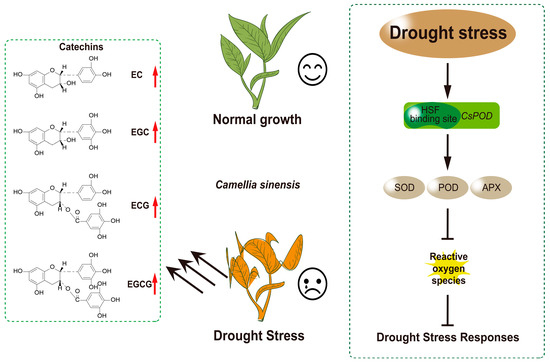 Under drought stress conditions, the expression of CsHsf10 is closely associated with increased antioxidant enzyme activity, which may be linked to the interaction between CsHsf10 and CsPOD17. This interaction could enhance antioxidant enzyme activity, effectively reducing the damage caused by reactive oxygen species (ROS) to tea plant cells and significantly improving the drought resistance of tea plants. Furthermore, the expression of CsHsf10 can also lead to a notable increase in the content of catechin components in tea plants under drought stress. However, the specific regulatory mechanism through which CsHsf10 influences catechin content remains unclear and requires further investigation to elucidate its role in the secondary metabolism of tea plants.