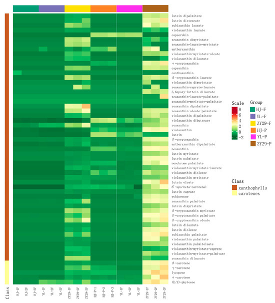 Carotenoid metabonomics and transcriptome analysis were performed on the flesh (F) and pericarp (P) of HJ, YL, and ‘ZY29’. Three independent biological replicates were used for each sample of HJ-F, HJ-P, YL-F, YL-P, ‘ZY29’-F, and ‘ZY29’-P, resulting in 18 samples. In carotenoid metabonomics, five carotene and 31 luteins were detected. The metabolite content data were processed by UV (unit variance scaling). R software’s ComplexHeatmap package (2.16.2) was used to draw a heat map, and HCA was conducted on the accumulation mode of metabolites among different samples. It can be seen from the figure that there was no obvious difference between the parents’ metabolites (HJ and YL). The obvious difference was mainly concentrated in ‘ZY29’, which indicates that the carotenoids of the honey peach after hybridization changed (Figure 2). In transcriptome detection, a total of 120.5 GB of clean data was obtained. We sequenced 18 samples with the BGISEQ platform, generating about 6.69 Gb bases per sample on average. The percentage of the Q20 base value was over 94.94%, and the average mapping ratio with the gene was 86.99%. A total of 24,858 genes were identified. (Table 1).