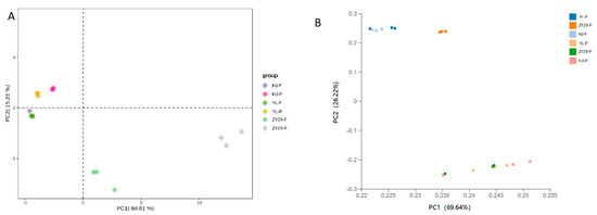 Principal component analysis (PCA) was performed on the transcriptome and metabolism group, respectively, which visually showed that there were significant differences between the two groups of samples, explaining 60.81% and 69.64% of the total variation, respectively (Figure 3A,B). These results indicated that there were significant differences in metabolites and genes related to the carotenoid metabolism of peach flesh (F) and pericarp (P) between the HJ, YL, and ‘ZY29’. The PCAs of the variance-stabilized estimated raw counts were also conducted.