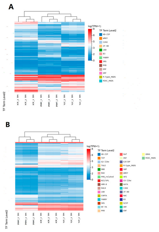 To identify the DEGs between ‘ZY29’ and its parents HJ and YL in the flesh and pericarp, the gene expression levels were estimated with the fragments per kilobase of exon per million fragments mapped (FPKM) values. The FPKM values in the flesh and pericarp were compared, and the DEGs were selected with the |log2Fold Change| ≥ 1 and false discovery rate (FDR) correction set at p < 0.05. A total of 652 common unigenes were identified in the flesh, and 2531 common unigenes were identified in the pericarp (Figure 4). A cluster analysis of the common DEGs between ‘ZY29’/HJ and ‘ZY29’/YL revealed significant differences in 652 common DEGs in the flesh and 2531 common DEGs in the pericarp. We also found differentially expressed transcription factors (TFs), mainly including C2H2, ERF, MYB, and WRKY and other transcription factors in the flesh, and TCP, bHLH, MYB, WRKY, and bZIP and other transcription factors in the pericarp. They were considered as predominant common differentially expressed TFs (Figure 5).
