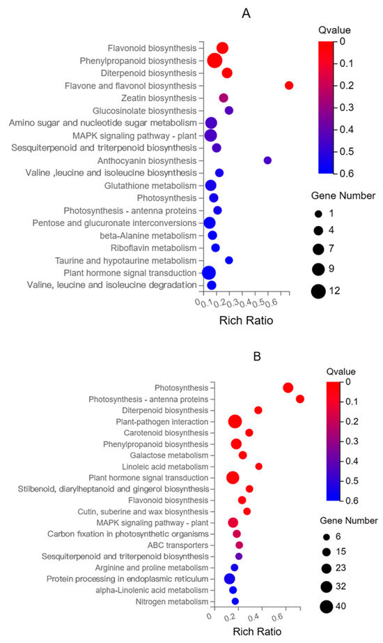 KEGG enrichment analysis. (A) DEGs in the flesh. (B) DEGs in the pericarp.
