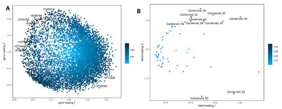 O2PLS analysis. (A) Gene loadings map. (B) Metabolite loadings graph. Note: The distance from each point to the origin in the graph or the height of the bar graph represents the magnitude of the correlation between the substance and another omics. The darker the color, the greater the correlation. The top 10 substances that have a significant impact on the other omics are indicated in the graph.