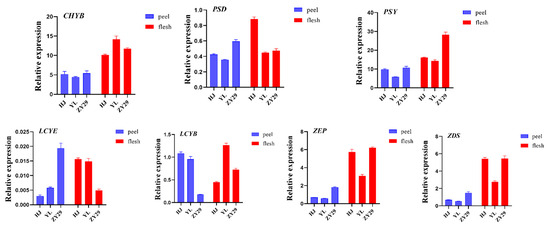 To verify the RNAseq results, HJ, YL, and ‘ZY29’ pericarp and fresh samples were verified by qPCR. The key genes of the carotenoid metabolic pathway, CHYB, PSD, PSY, LCYB, LCYE, ZEP, and ZDS were selected. The results showed that the expression trend of differentially expressed genes (DEGs) measured by qRT–PCR was consistent with the results of transcriptome sequencing, indicating that the transcriptome data were reliable (Figure 8). The primers used for qRT–PCR are listed in the Supplementary Materials (Table S3).