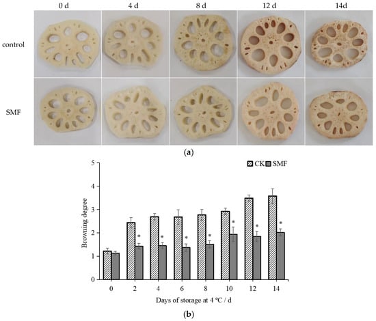Effects of SMF on sensory quality of fresh-cut lotus root. Note: (a) appearance changes of fresh-cut lotus root; (b) browning degree. * indicates a statistically significant difference (p < 0.05).