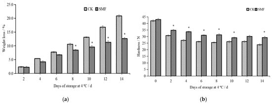 Effects of SMF on weight loss and hardness of fresh-cut lotus root. Note: (a) weight loss; (b) hardness. * indicates a statistically significant difference between different groups (in the same column) (p < 0.05).
