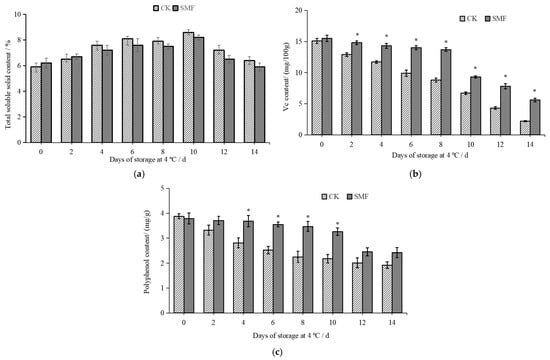 Effect of SMF on TSS content, Vit. C content, and polyphenol content of fresh-cut lotus root. Note: (a) TSS content; (b) Vit. C content; (c) polyphenol content. * indicates a statistically significant difference between different groups (in the same column) (p < 0.05).