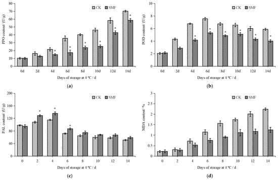 Effects of SMF on PPO, POD, PAL, and MDA activity of fresh-cut lotus root. Note: (a) PPO activity; (b) POD activity; (c) PAL activity; (d) MDA activity. * indicates a statistically significant difference between different groups (in the same column) (p < 0.05).