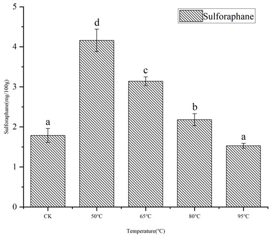 Sulforaphane content in broccoli stems following 1 h heat treatment at different temperatures. Different lowercase letters above bars indicate significant differences (p < 0.05) in sulforaphane content among broccoli stems subjected to different heating temperatures.