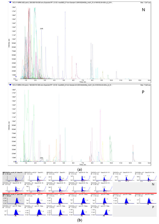 (a) MRM metabolite multi-peak profiles; (b) quantitative analysis with integrated peak correction for randomly selected metabolites across samples. X-axis: retention time (min); Y-axis: ion intensity (cps) of detected metabolite ions; peak area reflects relative abundance in samples. N: negative ion mode, P: positive ion mode.