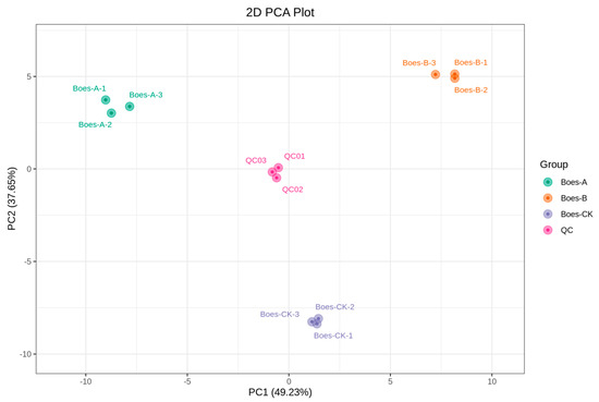 Metabolomic PCA of broccoli stems across temperature treatments. QC, quality control sample; Boes-A, 50 °C; Boes-B, 80 °C; Boes-CK, 25 °C. Numbers (1, 2, 3) denote triplicate biological replicates for each group.