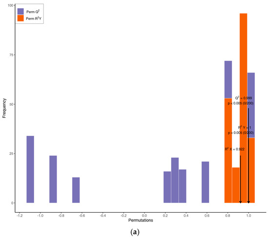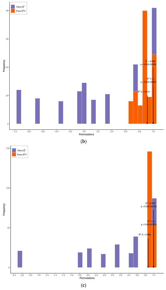 OPLS-DA score plots between the following pairs of groups: (a) Boes-B vs. Boes-A; (b) Boes-A vs. Boes-CK; (c) Boes-B vs. Boes-CK. X-axis: R2Y and Q2 values of models; Y-axis: frequency of classification efficacy observed across 200 permutation tests. Orange: R2Y of permutated models; Purple: Q2 of permutated models. Black arrows denote original model parameters (R2X, R2Y, Q2).