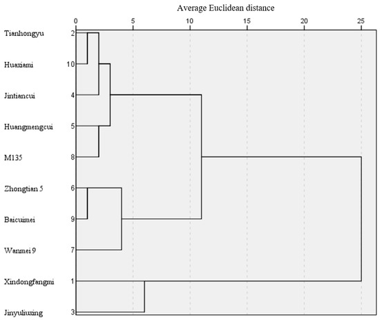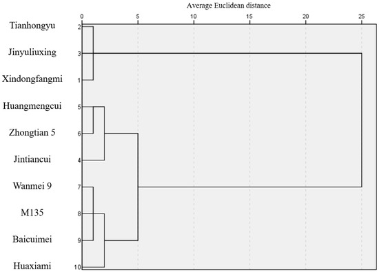 Average and comprehensive membership function values for salt tolerance were highest for ‘Xindongfangmi’ (0.749 and 0.820) and lowest for ‘Wanmei 9’ (0.233 and 0.208) (Table 12). Cluster analysis, using Euclidean distance and the Wald method, categorized the 10 varieties into 2 groups, effectively distinguishing their salt tolerance levels (Figure 2).