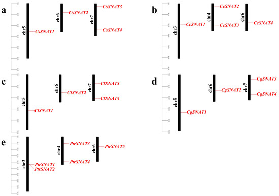 Chromosomal localization of the citrus SNAT genes: (a) chromosomal distribution of 4 CsSNAT genes on three citrus sinensis chromosomes; (b) chromosomal distribution of four CcSNAT genes on three citrus clementina chromosomes; (c) chromosomal distribution of 4 ClSNAT genes on three citrus limon chromosomes; (d) chromosomal distribution of four CgSNAT genes on three citrus maxima chromosomes; (e) chromosomal distribution of five PtrSNAT genes on three Poncirus trifoliata chromosomes. Note: the nomenclature and orientation of chromosomes in citrus has not been standardized.