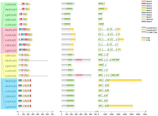 Gene structure, conserved domains, and motif analysis of the citrus SNAT genes.