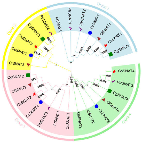 To elucidate the evolutionary relationships of citrus SNAT with those of other model species, protein sequences from Arabidopsis SNAT (3 sequences), rice SNAT (2 sequences), and citrus SNAT (21 sequences) were subjected to analysis, culminating in the construction of a phylogenetic tree (Figure 3). The phylogenetic analysis delineated four distinct subgroups. Group 1 comprised CgSNAT1, CsSNAT1, ClSNAT1, CcSNAT1, PtrSNAT1, and PtrSNAT2; Group 2 included PtrSNAT4, CgSNAT3, CsSNAT3, CcSNAT2, and ClSNAT3; Group 3 consisted of CgSNAT2, ClSNAT2, CsSNAT2, CcSNAT4, and PtrSNAT5; and Group 4 encompassed CcSNAT3, ClSNAT4, CgSNAT4, PtrSNAT3, and CsSNAT4. These findings suggest the potential for functional diversity within the citrus SNAT gene family. Furthermore, our analysis revealed that the majority of Arabidopsis and rice SNAT were predominantly clustered within Groups 3 and 4, with the exception of AtSNAT3, which was exclusively located in Group 1.