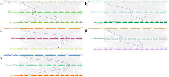 Collinearity relationships of SNAT genes in Arabidopsis, rice, and citrus. (a–e) A collinearity analysis was conducted on SNAT genes across five principal citrus species—namely, Citrus sinensis, Citrus clementina, Citrus limon, Citrus maxima and Poncirus trifoliata—as well as Arabidopsis and rice. The collinear relationships among SNAT members from these diverse species are represented by blue lines.