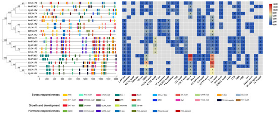 The sequence of the citrus SNAT gene, extending 2000 base pairs upstream of the transcriptional start site, was selected as the primary promoter region for the analysis of cis-acting elements. All cis-acting elements within the promoter region of each citrus SNAT gene were identified using the online tool PlantCARE (http://bioinformatics.psb.ugent.be/webtools/plantcare/html/ (accessed on 12 May 2024)). These elements were visualized and mapped using the TBtools software, followed by statistical analysis conducted in Excel.