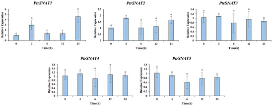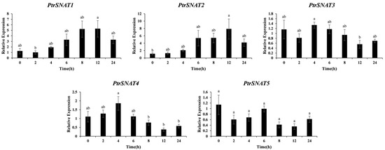 Expression pattern of SNAT gene in trifoliate orange under drought stress. Different letters indicate significant differences (ANOVA analysis, p < 0.05).