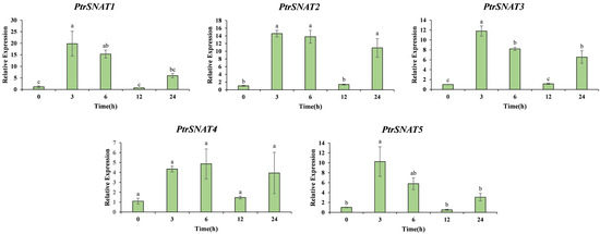 Expression pattern of SNAT gene in trifoliate orange under low temperature stress. Different letters indicate significant differences (ANOVA analysis, p < 0.05).