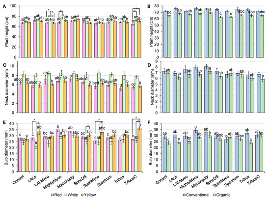 Effects of microbial biostimulants and fertilizer type on plant morphological parameters of three onion cultivars: red (Sofire), white (Carta Blanca), and yellow (Don Victoro). (A) Plant height of different onion cultivars treated with microbial biostimulants. (B) Plant height of onion under conventional and organic fertilizer with microbial biostimulants. (C) Neck diameter of different cultivars treated with microbial biostimulants. (D) Neck diameter of onion under conventional and organic fertilizer with microbial biostimulants. (E) Bulb diameter of different onion cultivars treated with microbial biostimulants. (F) Bulb diameter of onion under conventional and organic fertilizer with microbial biostimulants. Abbreviations: LALb, LALRISE Bacillus velezensis; LALMyco, LALRISE Mycorrhizae; MightyMyco, Mighty Mycorrhizae; SpecDS, Spectrum DS; SpecMyco, Spectrum Myco; Tribus, Tribus Original; TribusC, Tribus Continuum. Error bars represent standard error of the mean. Different letters within the same color of bars indicate significant differences at p ≤ 0.05 according to Duncan’s multiple range test. Asterisks (*) indicate significant differences between cultivars within a microbial biostimulant treatment at p ≤ 0.05 according to Duncan’s multiple range test.