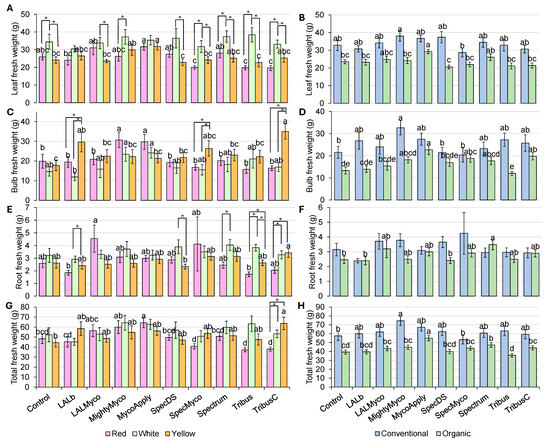 Effects of microbial biostimulants and fertilizer type on fresh weights of leaf, bulb, root, and total plant of three onion cultivars: red (Sofire), white (Carta Blanca), and yellow (Don Victoro). (A) Leaf fresh weight of different onion cultivars treated with microbial biostimulants. (B) Leaf fresh weight of onion under conventional and organic fertilizer with microbial biostimulants. (C) Bulb fresh weight of different onion cultivars treated with microbial biostimulants. (D) Bulb fresh weight under conventional and organic fertilizer with microbial biostimulants. (E) Root fresh weight of different onion cultivars treated with microbial biostimulants. (F) Root fresh weight of onion under conventional and organic fertilizer with microbial biostimulants. (G) Total fresh weight of different onion cultivars treated with microbial biostimulants. (H) Total fresh weight of onion under conventional and organic fertilizer with microbial biostimulants. Abbreviations: LALb, LALRISE Bacillus velezensis; LALMyco, LALRISE Mycorrhizae; MightyMyco, Mighty Mycorrhizae; SpecDS, Spectrum DS; SpecMyco, Spectrum Myco; Tribus, Tribus Original; TribusC, Tribus Continuum. Error bars represent standard error of the mean. Different letters within the same color of bars indicate significant differences at p ≤ 0.05 according to Duncan’s multiple range test. Asterisks (*) indicate significant differences between cultivars within a microbial biostimulant treatment at p ≤ 0.05 according to Duncan’s multiple range test.