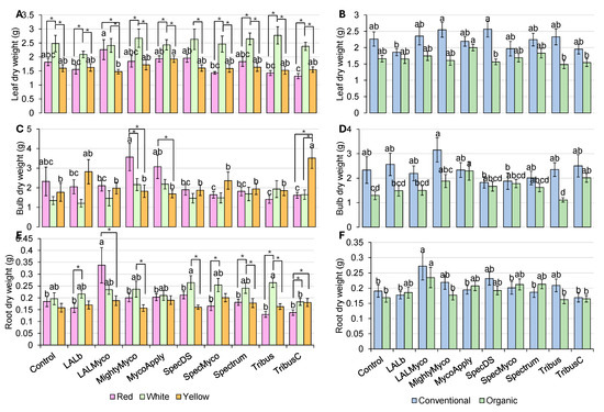 Effects of microbial biostimulants and fertilizer type on dry weights of leaf, bulb, and root of three onion cultivars: red (Sofire), white (Carta Blanca), and yellow (Don Victoro). (A) Leaf dry weight of different onion cultivars treated with microbial biostimulants. (B) Leaf dry weight of onion under conventional and organic fertilizer with microbial biostimulants. (C) Bulb dry weight of different onion cultivars treated with microbial biostimulants. (D) Bulb dry weight under conventional and organic fertilizer with microbial biostimulants. (E) Root dry weight of different onion cultivars treated with microbial biostimulants. (F) Root dry weight of onion under conventional and organic fertilizer with microbial biostimulants. Abbreviations: LALb, LALRISE Bacillus velezensis; LALMyco, LALRISE Mycorrhizae; MightyMyco, Mighty Mycorrhizae; SpecDS, Spectrum DS; SpecMyco, Spectrum Myco; Tribus, Tribus Original; TribusC, Tribus Continuum. Error bars represent standard error of the mean. Different letters within the same color of bars indicate significant differences at p ≤ 0.05 according to Duncan’s multiple range test. Asterisks (*) indicate significant differences between cultivars within a microbial biostimulant treatment at p ≤ 0.05 according to Duncan’s multiple range test.