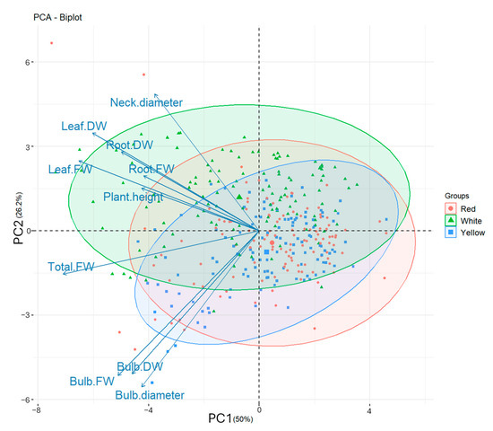 PCA biplot of onion morphological and biomass parameters grouped by onion cultivars: red (Sofire), white (Carta Blanca), and yellow (Don Victoro). FW: fresh weight; DW: dry weight.