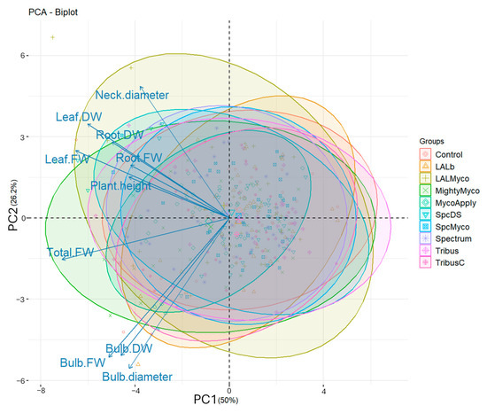 PCA biplot of onion morphological and biomass parameters grouped by microbial biostimulants. Abbreviations: LALb, LALRISE Bacillus velezensis; LALMyco, LALRISE Mycorrhizae; MightyMyco, Mighty Mycorrhizae; SpecDS, Spectrum DS; SpecMyco, Spectrum Myco; Tribus, Tribus Original; TribusC, Tribus Continuum; FW, fresh weight; DW, dry weight.