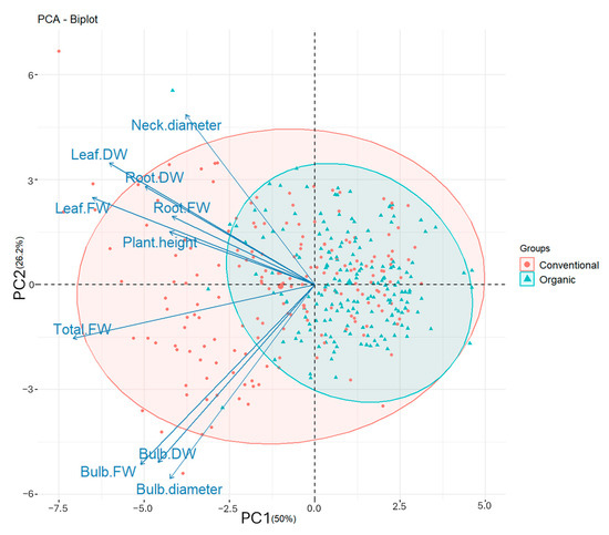 PCA biplot of onion morphological and biomass parameters grouped by fertilizer types. FW: fresh weight; DW: dry weight. Conventional: conventional fertilizer Osmocote Plus 15-9-12; Organic: organic fertilizer Sustane 4-6-4.