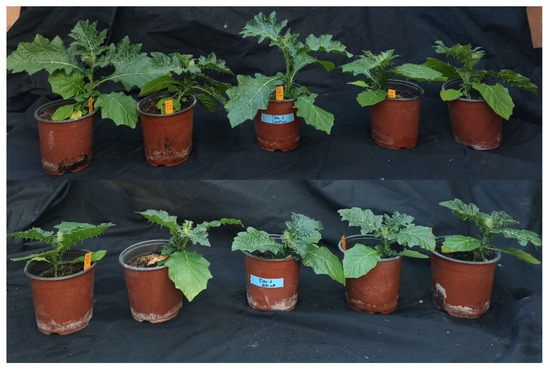 - Zayova, E.; Philipov, P.; Nedev, T.; Stoeva, D. Response of in Vitro Cultivated Eggplant (Solanum melongena L.) to Salt and Drought Stress. AgroLife Sci. J. 2017, 6. Available online: https://agrolifejournal.usamv.ro/index.php/agrolife/article/view/686 (accessed on 10 March 2024).