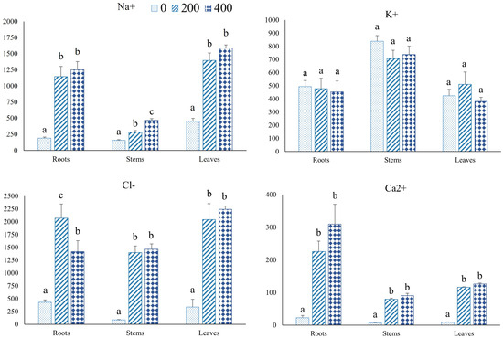 Ion content was one of the most affected parameters under salinity stress. Na+ increased significantly under 200 and 400 mM NaCl irrigation, almost 7-fold in roots and 3.5-fold in leaves, when the salt concentration was the highest (Figure 3). Na+ values in the stem were lower than in the root and leaf; however, this organ showed higher differences between the tested salt treatments, indicating ion movement through the plant vessels. Cl− levels showed a 6-fold increase in leaves and a 15-fold increase in stems for salt treatments. However, roots showed a 4.5-fold increase for 200 mM and a 3.2-fold increase for 400 mM NaCl treatment. No reduction was observed in root, stem, or leaf K+ contents under the salt treatments (Figure 3), but Na+/K+ ratios increased in roots, stems, and leaves under salt treatment (Figure 3). The divalent cation Ca2+ showed an increase in roots, stems, and leaves under salt stress, although without significant differences between the two salt concentrations (Figure 3). Under control conditions, roots showed more than double Ca2+ concentration than stems and leaves.
