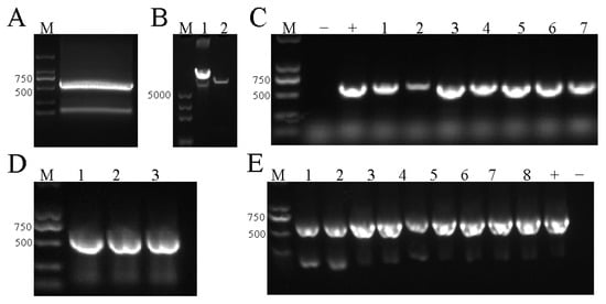 The recombinant plasmid was introduced into E. coli DH5α competent cells using heat shock. Positive clones were identified using bacterial PCR, followed by culture expansion and extraction of the recombinant plasmid. Plasmid PCR was conducted to identify transformants, and the recombinant plasmid was then sequenced.