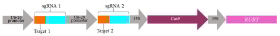 The size of the 35S-RUBY band t was consistent with the expected band size (Figure 1C). The recovered 35S-RUBY target band was recombined with the MfeI-digested pHEE401E-35S-Cas9 plasmid. After transformation into E. coli DH5α competent cells, verification by bacterial and plasmid PCR (Figure 1E) indicated successful construction of the pHEE401E-35S-RUBY vector. The vector structure is shown in Figure 2.