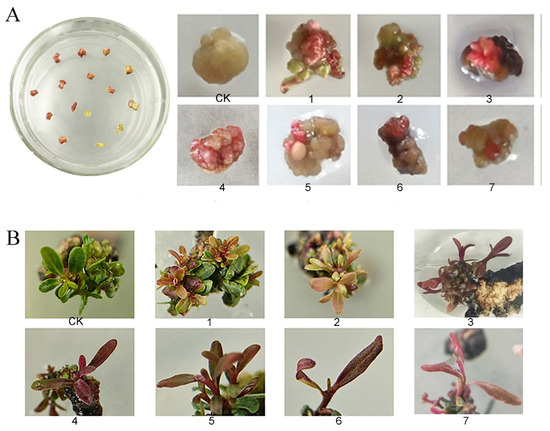 Transformed calli and buds of Eucalyptus urophylla × Eucalyptus grandis. Note: (A): left panel displays the overall status of callus in the culture dish; CK: the control group; 1–7: which represent transformed callus. (B): CK: the control group; 1–7: which represent transformed buds.