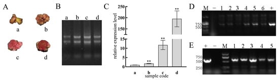 Combined diagram. Note: (A): representative images of calli with different degrees of red coloration; a–d: the calli exhibit a progressive increase in redness (B,C): RNA bands and qPCR results, ** p = 0.01; (D): M. DL 2000 DNA Marker. 1–6: RUBY identification in red calli after EuC4H transformation; (E): M. DL 2000 DNA Marker. 1–5: gene editing identification of EuC4H. +: positive reference, −: negative reference.