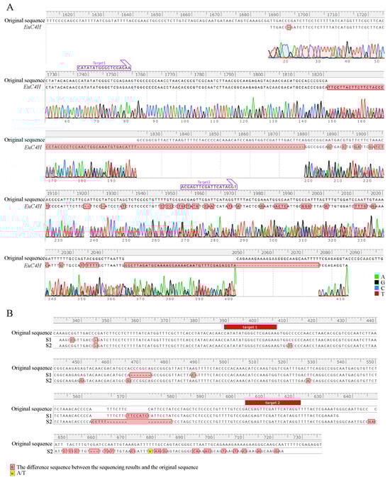 DNA from red callus tissue was used as a template to identify the marker gene RUBY. The PCR products were approximately 750 bp (Figure 6D; Table 4), consistent with the expected size and suggesting successful integration of RUBY into the callus tissue at a high transformation efficiency (the average transgenic efficiency was 63.3%). Gene editing results were then verified using EuC4H-specific primers. The average gene-editing efficiency was 0.0876% (Table 4). As shown in Figure 6E, Lane 3 exhibited two bands, with the smaller band between 250 and 500 bp, consistent with the expected size post-editing. This smaller band was recovered for sequencing, and the sequencing results were compared with the expected sequence (Figure 7A). The analysis revealed overlapping peaks starting from 125 bp. Using the Sanger sequencing check advanced plugin from TBtools version 1.120, with the Gap Extension parameter set to 0 and other parameters at default settings, two allelic sequences, S1 and S2, were derived after separating the peaks. A comparison of these two allelic sequences with the reference sequence (Figure 7B) revealed insertions, deletions, and partial base mutations in the EuC4H gene between and beyond the two target sites, preliminarily confirming the successful editing of the target gene.