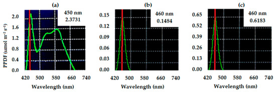 Characterization of white light at 400 μmol m−2 s−1 (a) and blue light at 5 (b) and 20 μmol m−2 s−1 (c), used according to the treatment. The red vertical line in each panel marks the peak wavelength of the light source used in that treatment, and the green curve shows the spectral distribution of photon flux, basically how light energy is spread across different wavelengths.