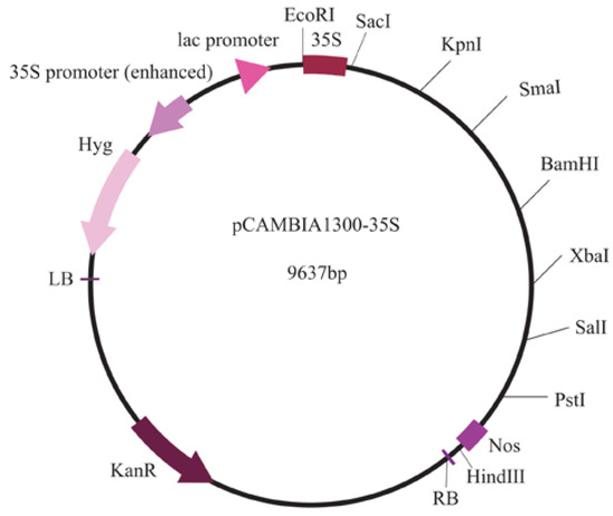 Based on the transcriptomic data of H. middendorffii in our previous study, the FLOWERING LOCUS T (FT) gene was selected as the target for vector construction. Specific primers for FT amplification were designed using Primer Premier 5.0 (Premier Biosoft, Palo Alto, CA, USA), and the sequences are presented in Supplementary Table S1. The binary vector pCAMBIA1300 (Cambia, Canberra, Australia) was modified by inserting the cauliflower mosaic virus (CaMV) 35S promoter into the EcoRI and SacI restriction sites and replacing the native CaMV polyA terminator with the nopaline synthase (NOS) terminator (Figure 1). The cloned FT gene from H. middendorffii, designated HmFT (GenBank No. KU821026, full sequence in Supplementary Figure S1), was ligated into the KpnI and PstI sites of the modified vector (pCAMBIA1300-35S) using T4 DNA ligase (Tsingke Biotechnology, Beijing, China). The resulting recombinant plasmid, pCAMBIA1300-35S-HmFT, was introduced into A. tumefaciens strain EHA105 (Tsingke Biotechnology, Beijing, China) via the freeze–thaw method [25].