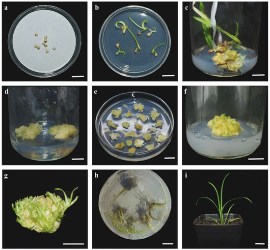 Regeneration process of H. middendorffii plantlets from seeds. Seeds removed from both the inner and outer seed coats (a). Germination status of seeds after 14 days (b). Calli induced from seedlings after 6 weeks of cultivation on the callus induction medium (c). Proliferation of calli on the callus proliferation medium (d). Initiation of shoot formation from calli on the differentiation medium (e). Progress of shoot induction after 3 weeks (f). Development of shoots after 5 weeks (g). Root initiation observed in a single shoot on the rooting medium after 1 month (h). Plantlets being acclimatized in pots (i). Scale bar = 1 cm.