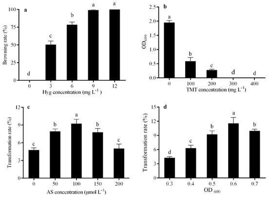 Effect of hygromycin (Hyg) concentration on the callus browning rate (a). Impact of Timentin (TMT) concentration on the A. tumefaciens culture solution optical density at 600 nm (OD600) (b). Effect of OD600 value on the transformation rate (c). Influence of acetosyringone (AS) concentration on the transformation rate (d). Hyg, hygromycin; TMT, Timentin; AS, acetosyringone. Different lowercase letters indicate significant differences at the 5% level based on Duncan’s multiple range test (p < 0.05).