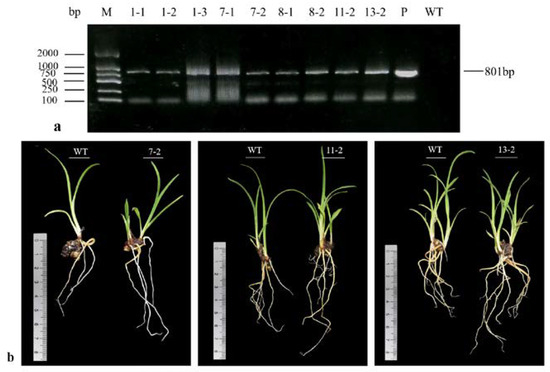 The transgenic status of regenerated plants was initially confirmed by PCR amplification using 35S sequence-specific primers. Following hygromycin selection, a total of 16 candidate positive plants were obtained and designated as lines 1–15. After differentiation, each line produced at least two replicates. Through three independent experimental replicates, PCR products corresponding to the 801 bp 35S sequence fragment were successfully amplified (Figure 5a). The PCR products were derived from transgenic lines 1-1, 1-2, 1-3, 7-1, 7-2, 8-1, 8-2, 11-2, and 13-2, resulting in a positive line rate of 32.8%. Lines 2, 3, 4, 5, 6, 9, 10, 12, 14, and 15 were identified as false positives. The Sanger sequencing validation results are presented in Supplementary Figure S2.