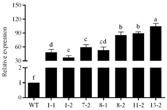 The qRT-PCR results indicated that the expression levels of HmFT in transgenic plants were significantly upregulated compared with WT plants (Figure 6). The relative expression level in the 13-2 transgenic line was 100 times higher than that in WT plants. These results demonstrated that pCAMBIA1300-35S-HmFT expression vector plasmid was successfully introduced into the H. middendorffii genome and expressed.