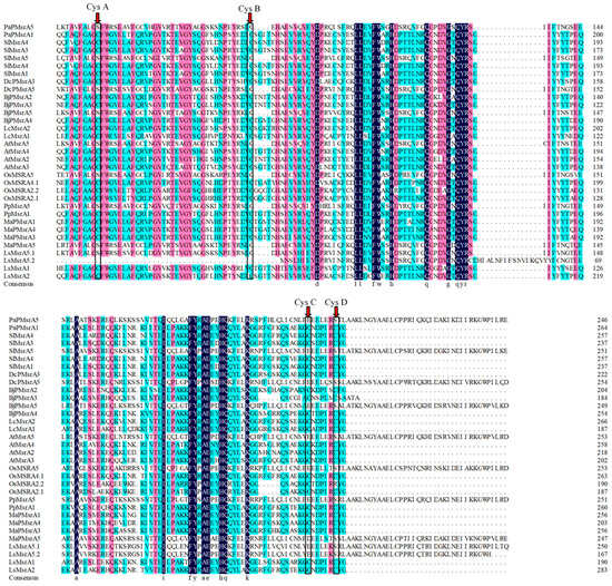 The classification of MsrA and MsrB in plants is based on two key criteria: function and evolutionary relationships. The functional classification considers the number of cysteine residues, which influences the enzyme’s catalytic mechanism and redox activity [33]. Meanwhile, the evolutionary classification groups MsrA and MsrB are based on their phylogenetic relationships, reflecting their divergence and conservation across different plant species [34]. Clarifying these classifications helps to better understand their structural and functional diversity in plants. When discussing the first classification, it is necessary to examine cysteine (Cys). Cys plays a pivotal role in Msr due to its reducing properties [35,36]. As shown in Figure 1, the distribution of Cys residues is largely conserved among different MsrA enzymes, with two located at the N-terminus (CysA and CysB) and two at the C-terminus (CysC and CysD). CysA, the catalytic residue, is positioned within the conserved sequence F[A/G]AGCFW[G/R]VELA, where “GCFW” is a hallmark motif for identifying MsrA. CysB, also at the N-terminus, is conserved but not essential for catalysis. The C-terminal cysteines, CysC and CysD, are located within the highly conserved motif KGC[N/A/K]DPI[R/N]CYG, where they form a disulfide loop in Msr. The number of Cys residues involved in the reduction process varies among MsrA enzymes, which can be classified into three categories: (1) enzymes containing three conserved Cys residues, two of which participate in the MsrA catalytic process, a characteristic observed in most plants and Escherichia coli [37]; (2) enzymes with two conserved Cys residues, one of which functions as a reducing MsrA, as exemplified by Mycobacterium tuberculosis [38]; and (3) MsrA enzymes possessing two conserved Cys residues but lacking reducing Cys residues within their sequences, as seen in the genus Synechocystis [20].