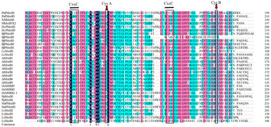 As shown in Figure 2, the MsrB sequences exhibit high homology, with most containing two “CxxC” motifs and two conserved cysteine residues. However, the number of reducing cysteines varies among MsrB variants, which can be classified into two categories based on this number: (1) MsrB containing one reducing Cys in the sequence, such as MsrB in most plants [39] and (2) MsrB not containing reducing Cys in the sequence, such as MsrBl of Arabidopsis [40].